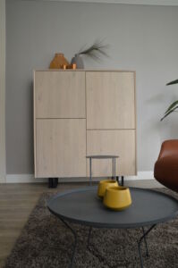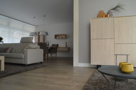 Een nieuwe tegelvloer in houtlook, die doorgetrokken wordt over de hele benedenverdieping, vormt een goed basis. Samen met de opdrachtgever hebben we de meubels en verlichting uitgezocht.